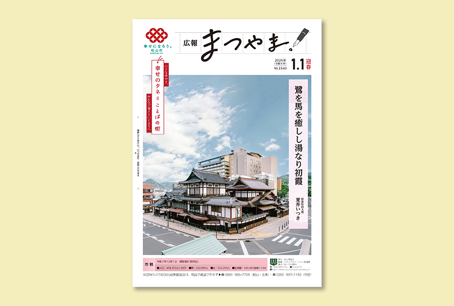 2026.01.31市の主な行事やお知らせなどを掲載する「広報まつやま」。令和8年1月1日号から広報紙をリニューアルしました。タイトルデザインも変更し、万年筆と方眼紙で文学のまちを表現しています。表紙には、今年の干支「馬」と季語「初霞」を詠み込んだ、夏井いつきさんの俳句が掲載され、新春を寿ぐ(ことほ-ぐ)気持ちが伝わってくるようです。