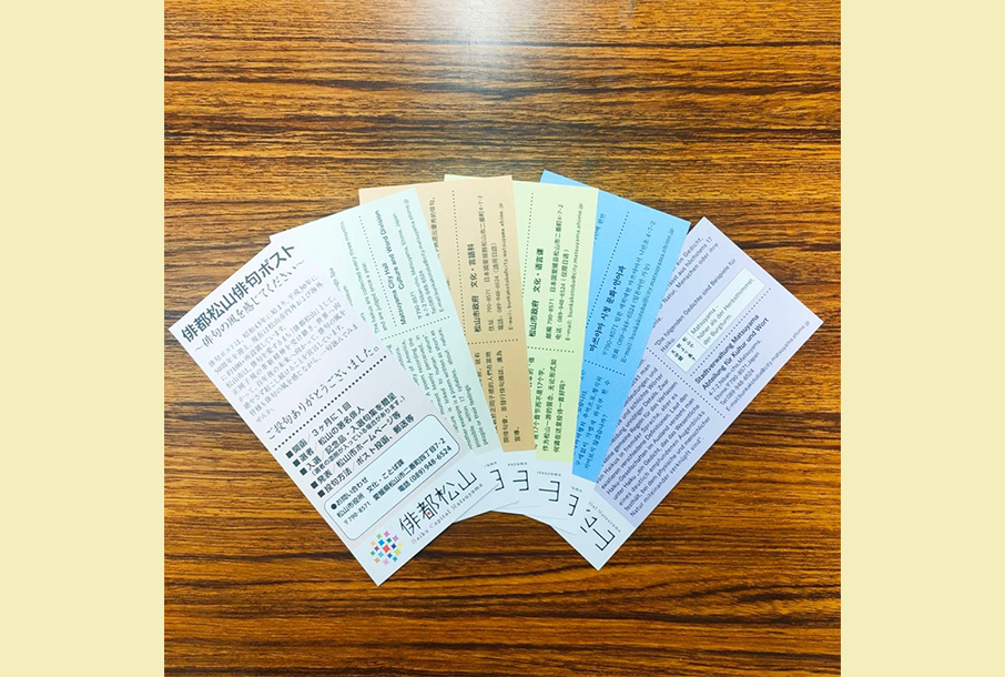 答えは6種類です! 松山市民の方々、松山市を訪れた観光客の方々に俳句を楽しんでもらうために、日本語のほかにも、英語、中国語(繁体字・簡体字)、韓国語の用紙を俳句ポストに置いています。さらに、ドイツのフライブルク市にはドイツ語の用紙を置いています! 言語ごとに用紙の色が違い、かわいいデザインになっています。