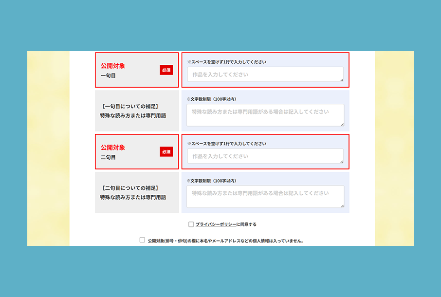 特殊な読み方または専門用語等の説明が必要なければ、空欄でも問題なくご投句いただけます。なお、特殊な読み方または専門用語の欄に記載した「作句の意図・背景」の有無で、選句の評価が変わることはありません。